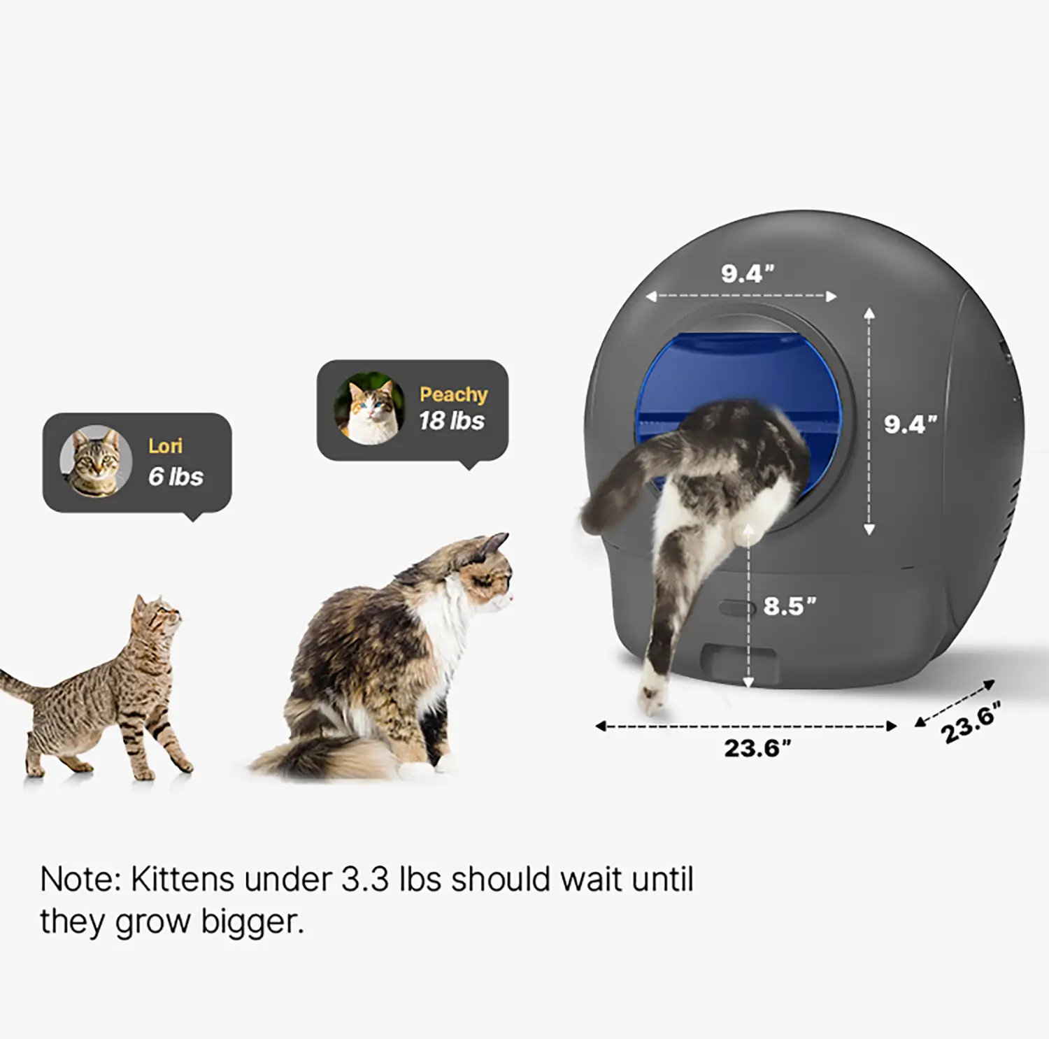 One box for all—saving space and hassle! The large 5L litter bed provides a thick layer for digging and covering, reducing refill frequency. With a spacious 60L interior, cats up to 25 lbs can fit comfortably.Note: Kittens under 3.3 lbs should wait until they grow bigger.