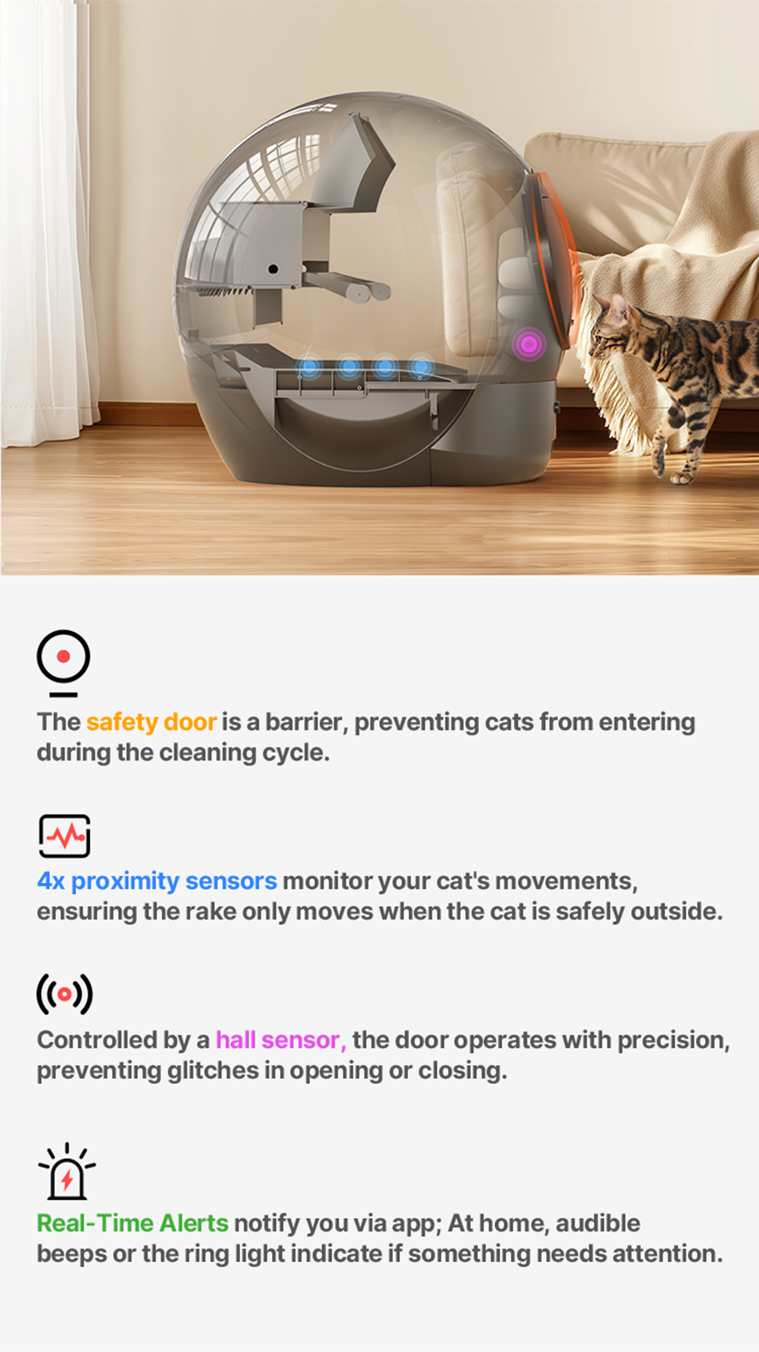 Absolutely! The Spaceship II has four sensors that work together to make sure it only cleans when your cat isn't inside. You can set the clean cycle delay up to 30mins for extra control. During cleaning, the safety door closes and only reopens once cleaning is complete—keeping curious cats from peeking in. If the door senses any nudges, you’ll get an app notification, so you’re always up-to-date on your cat's activity!