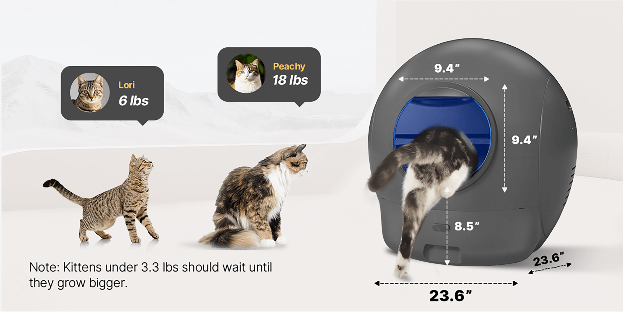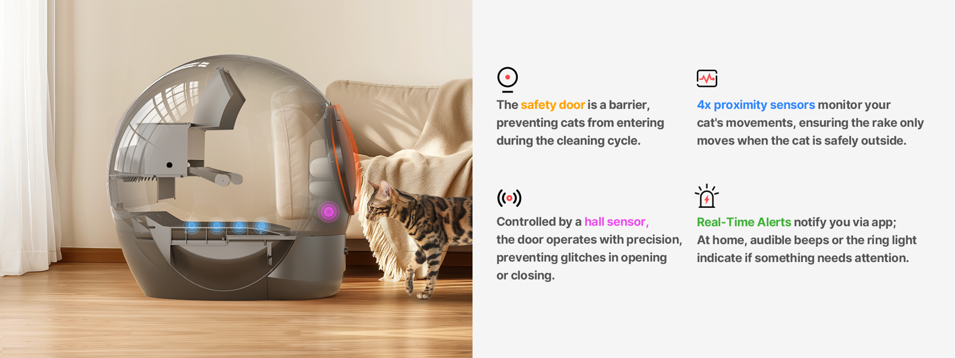 „Verabschieden Sie sich endgültig vom Schaufeln“ mit einer selbstreinigenden Katzentoilette, geben Sie Katzenbesitzern die Hände frei und halten Sie Ihr Zuhause frisch. Wir haben diese Katzentoilette entwickelt, um Katzentoilettengerüche zu neutralisieren und Ihrer Katze mit Els Pet jedes Mal ein sauberes Katzenstreubett zu bieten. Die Katzentoilette sieht aus wie ein Raumschiff und hat eine Sicherheitstür, die die Reinigung automatisch stoppt, wenn die Katze gegen die Tür drückt. Außerdem bietet die selbstreinigende Katzentoilette nicht nur maximalen Komfort für Katzen aller Größen, sondern verfügt auch über vierfache Sicherheitsvorkehrungen – Infrarotsensor, Roboterarmsensor, Sicherheitswarnung und automatische Erkennung. Sie können das Fernbedienungs- und Reinigungssystem in der „elspet“-App verwenden – erfahren Sie mehr über die Toilettengewohnheiten Ihrer Katze und verfolgen Sie die Gesundheitsprobleme Ihrer Katze. Schließen Sie sich 300.000 Tierbesitzern an, die auf eine intelligentere Katzentoilette umgestiegen sind. *Katzentoiletten sind nicht für Katzen mit einem Gewicht von weniger als 1,5 kg geeignet.